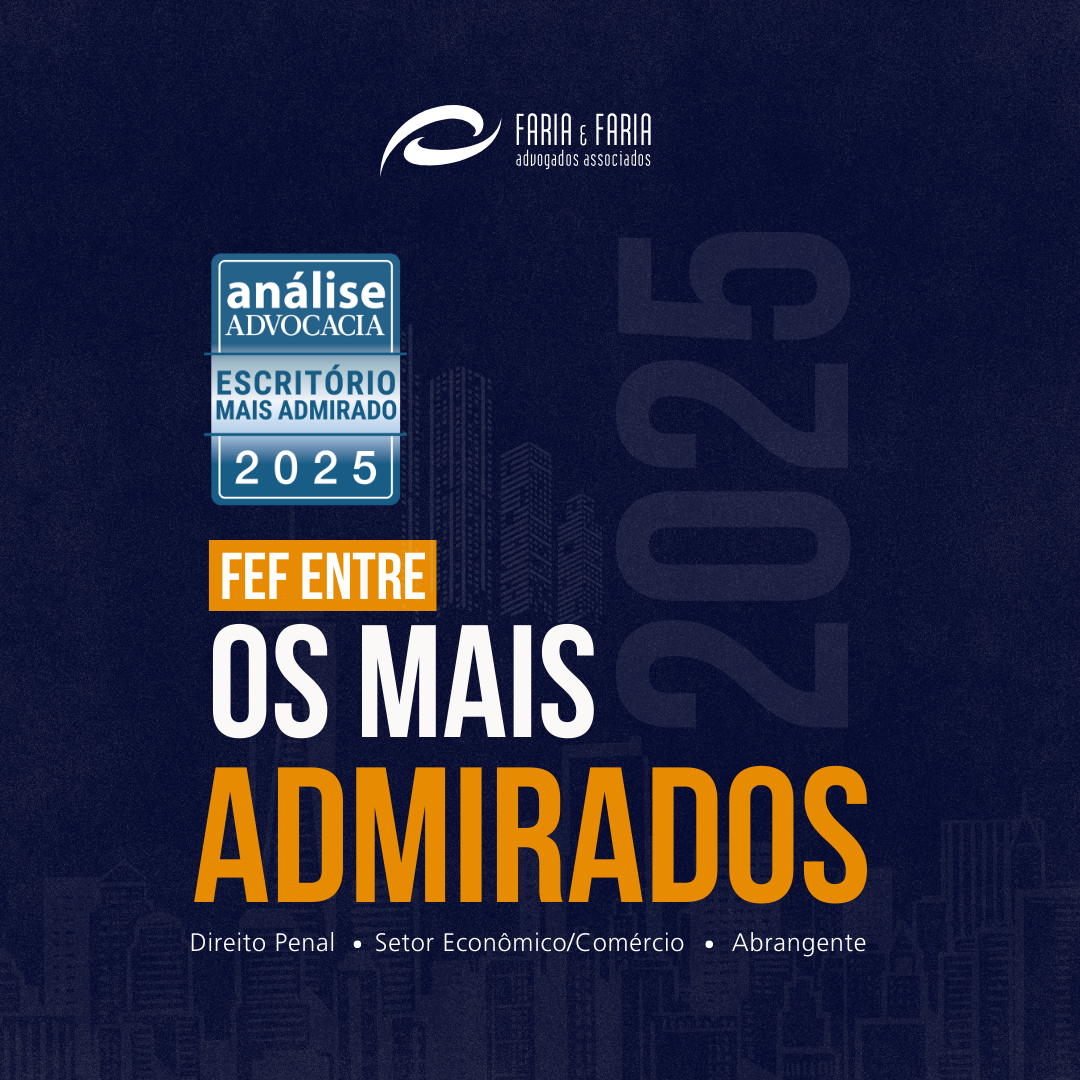 O Escritório Faria e Faria Advogados tem o orgulho de estar, uma vez mais, entre os “Mais Admirados” da revista @analise.editorial em três categorias: Direito Penal, Setor Econômico/Comércio e no Estado de São Paulo.